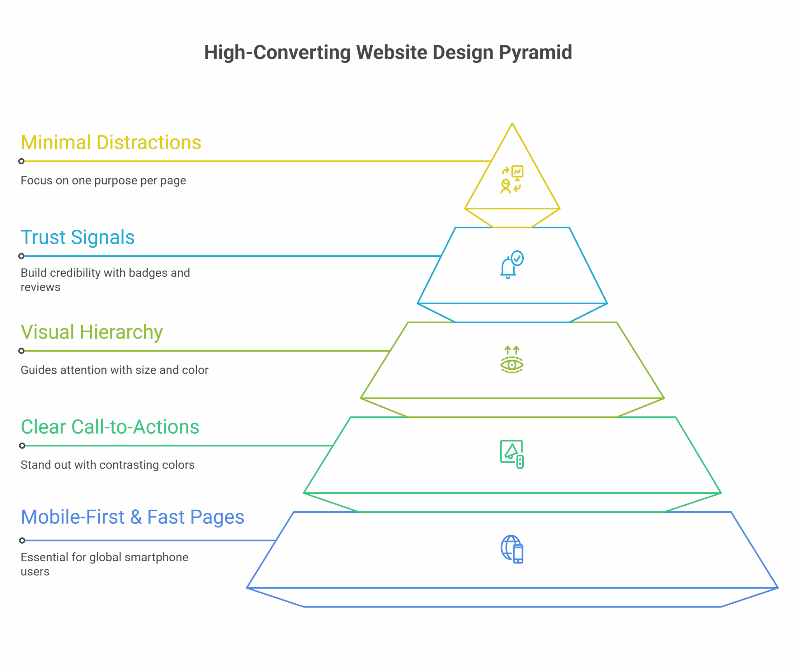 Key elements of a high-converting website design include clear and visible call-to-actions, a visual hierarchy that guides attention, trust signals like testimonials and security badges, mobile-first and fast-loading pages, and minimal distractions with focused layouts.